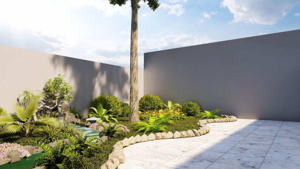 Chọn vị trí: Chọn vị trí phù hợp để thiết kế tiểu cảnh sân vườn. Vị trí cần có đủ ánh sáng, đất màu mỡ và đủ không gian để phát triển.
